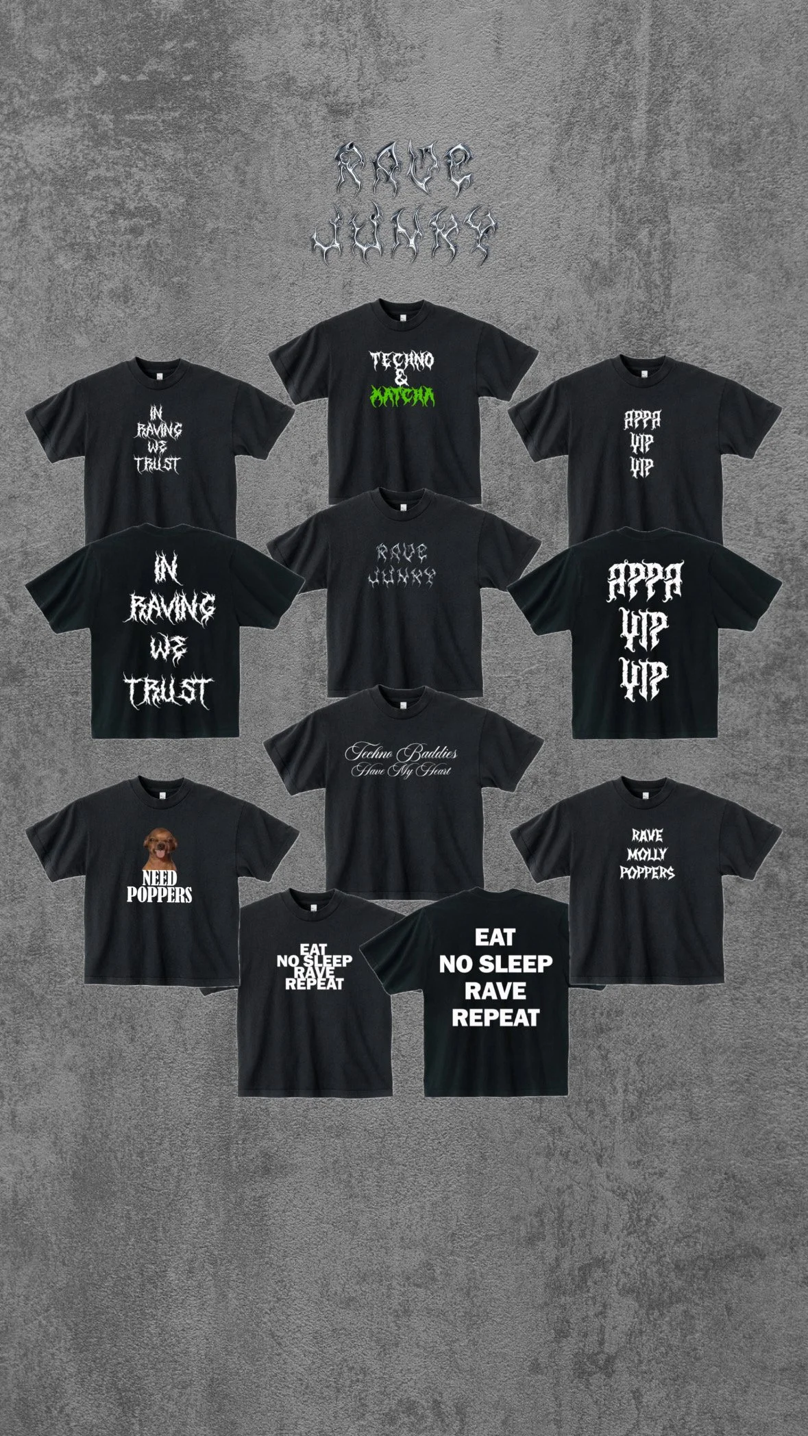 REBIRTH: NEW DROP Shop all IN RAVING WE TRUST APPA YIP YIP TECHNO BADDIESHAVE MY HEART Tag us in your rave junky @RAVEJUNKYY Social